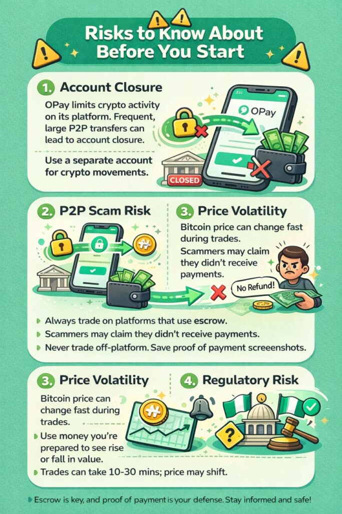 Don’t forget the risks involved. OPay can close accounts it flags for crypto activity, and P2P trading has its own dangers if you’re not careful. I’d say: use platforms with escrow, take time to vet sellers, save every receipt, and never trade off-platform.