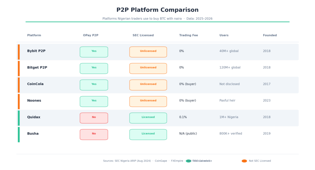 | CoinCola | A Hong Kong-based OTC platform popular in Nigeria that explicitly supports OPay for buying and selling Bitcoin |