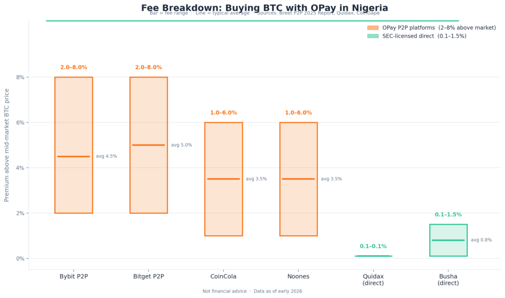 When buying BTC with OPay through P2P, there are two main costs I advise accounting for:
